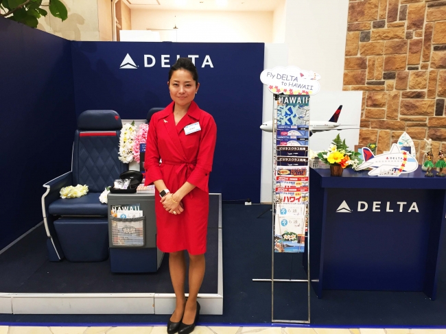 デルタ航空では会場に特設ブースを出展し、関空-ホノルル路線で使用しているものと同型のビジネスクラス「デルタ・ワン」のシートを展示し、機内サービスを体験できるコーナーを設置するほか、機内誌やハワイ路線のリーフレットを配布します。また、週末の8日と9日には、客室乗務員がデルタ航空ロゴ入りのプルメリアの髪飾り(数量限定)をお配りします。