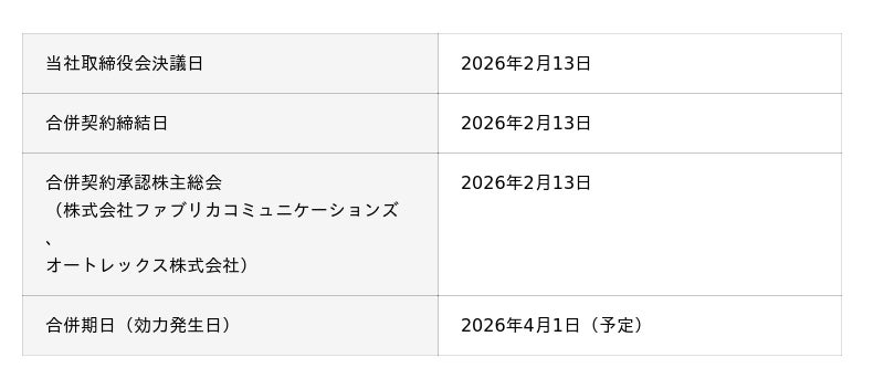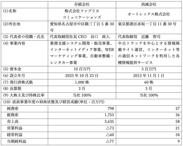 株式会社ファブリカコミュニケーションズを存続会社、オートレックス株式会社を消滅会社とする