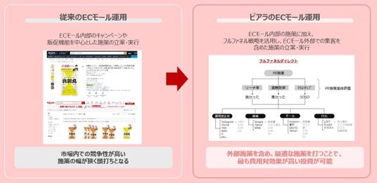 ピアラは、PRやSNS、ギフティングなどのモール外のきっかけ作りを得意とし、外部施策が売上にどうつながるかを分析・設計するフルファネル支援に強みを持っています。