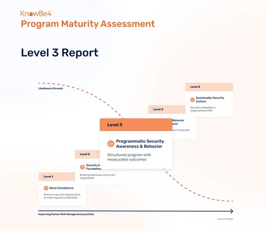 評価が完了すると、ユーザーには5段階のスケールによるパーソナライズされた成熟度分類、すべての指標に関する視覚的なフィードバック、および優先順位付けされた推奨事項が共有されます。取り組みをさらに深めたい場合は、KnowBe4 HRM+(ヒューマンリスクマネジメント)プラットフォームによる成熟度加速および持続的なセキュリティ文化の構築方法について、追加でご相談いただけます。