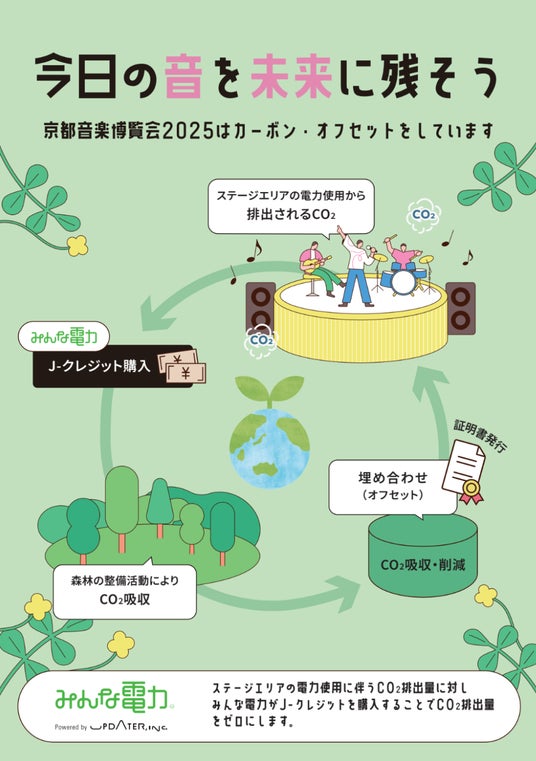 UPDATERは、京都音楽博覧会2025のステージエリアの電力使用に伴って発生するCO2排出量を算定し、その同量のJ-クレジットを購入することで排出量を実質ゼロにします。
