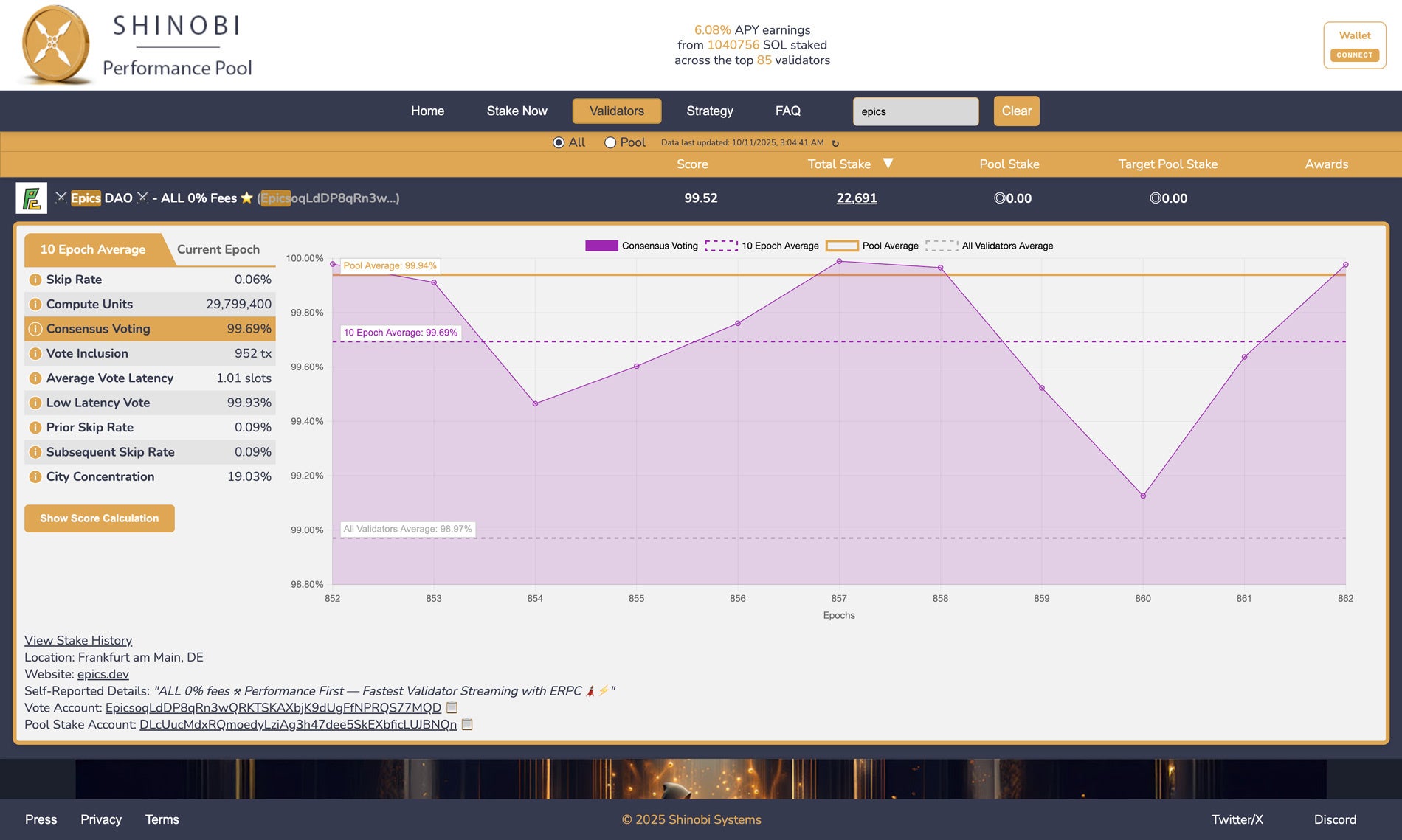 バリデータパフォーマンス情報 (Shinobiスコア): https://xshin.fi/#Validators?pubkey=EpicsoqLdDP8qRn3wQRKTSKAXbjK9dUgFfNPRQS77MQD