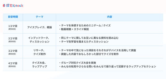 まず、オリジナルプログラムとして、問いを生み出す力の習得を目指す「問いってそもそも何だろう?」と、自らの探究活動のプロセスを表現する力の習得を目指す「探究の成果をまとめよう!」(8月下旬よりダウンロード可能)の2つをご用意。今後は、国語、数学、情報リテラシー、AI、金融、食など幅広いテーマの教材を開発予定です。加えて、各教材は、2~4回分の授業で1つのテーマを学ぶことができ、カスタマイズがしやすい設計になっています。