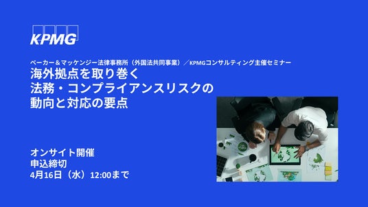 本セミナーでは、KPMGコンサルティングがベーカー&マッケンジー法律事務所(外国法共同事業)(以下、ベーカー&マッケンジー法律事務所)との共著により中央経済社から発行した書籍『海外子会社リーガルリスク管理の実務〈第2版〉』を踏まえて、グローバル内部通報制度、サステナビリティ規制における苦情処理制度、輸出管理、サプライチェーンリスク管理といった個別のテーマについて、国際情勢や規制の最新動向や企業に求められる取組みを解説いたします。終了後のネットワーキングでは、登壇者や来場参加者との交流も予定しております。