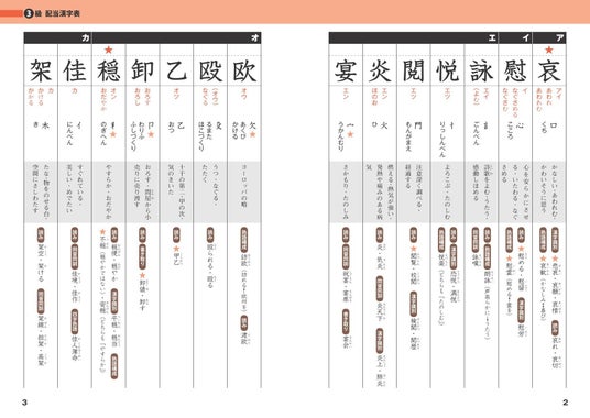 (『でる順×分野別 漢検問題集 3級 六訂版』 別冊 配当漢字表 紙面イメージ)