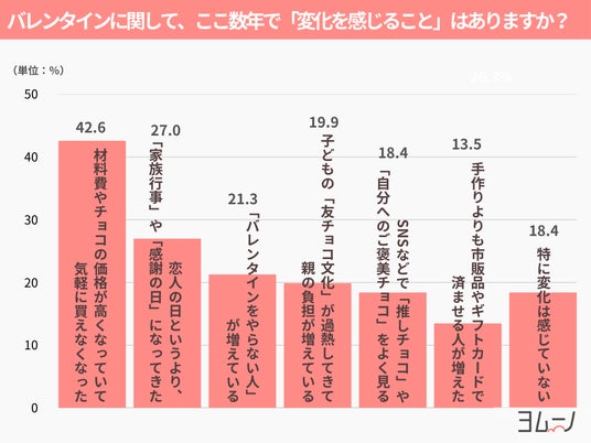 近年のバレンタインの変化として最も多かったのが、「材料費やチョコの価格が高くなっていて、気軽に買えなくなった(42.6%)」でした。さらに「“恋人の日”というより、“家族行事”や“感謝の日”になってきたと思う(27.0%)」という回答が続きます。