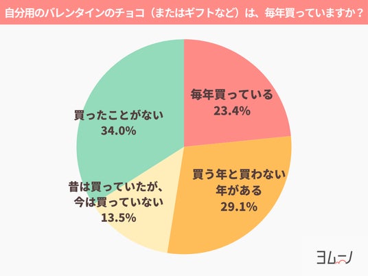 一方、自分用にチョコ・ギフトを「毎年買っている」と答えた方は23.4%にとどまり、「買ったことがない(34.0%)」と回答した方が最も多い結果に。
