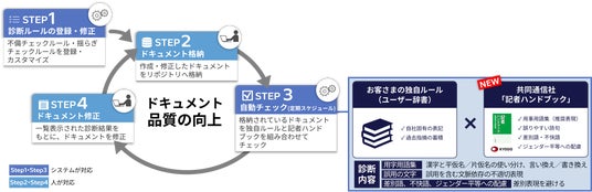 本機能は、日立ソリューションズが、一般社団法人共同通信社(本社:東京都港区、社長:水谷 亨)とライセンス契約を締結して開発しました。これまでは、設定した企業やプロジェクト固有の表記や表現を元にルール診断を行い、統一を促してきましたが、新たに、「記者ハンドブック」に掲載されている仮名遣いや送り仮名といった用字用語の統一、人権に配慮した表現など、約4,500件の項目を自動で診断することが可能になります。
