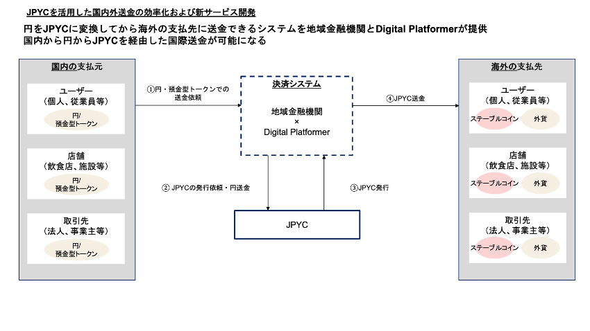 本共同検討では、既存の地域型ステーブルコインの先行事例(例:「トチカ」など)を参考に、すでに国際送金等にも利用可能なJPYCを活用することによる、地域トークンの利便性の向上の可能性を検討していきます。