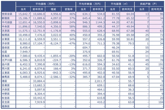 東京23区の各行政区毎に、平均価格、平均坪単価、平均面積、供給戸数をまとめました。当月の平均価格が大きい順に表示しています。