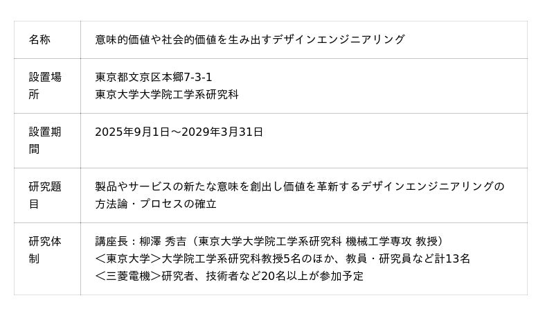 三菱電機株式会社(以下、三菱電機)と国立大学法人東京大学大学院工学系研究科(以下、東京大学)は、社会連携講座「意味的価値や社会的価値を生み出すデザインエンジニアリング」を9月1日に開設しました(※1)。本講座では、製品・サービスの価値向上に向け、「意味的価値」や「社会的価値」を生み出すための設計方法論や創出プロセスを形式知化(※2)し、新たなデザインエンジニアリングとして確立することを目指します。また、工学的素養を有し、学校教育の高度化をリードする人材の育成や、企業でイノベーション創出を担う人材の育成にも取り組みます。