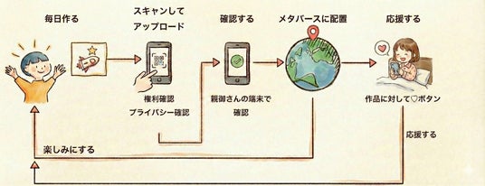 「描いたものが、明日現れる」、子どもたちが手元で描いた絵や工作を、保護者向けツールでアップロードすると、API連携によって翌日にはメタバース内の「作品展示エリア」に自動で配置されます。 自分の作品がメタバース空間に掲載されることによる、子どもたちの「明日を楽しみにする」気持ちを育みます。