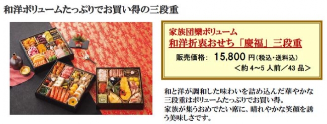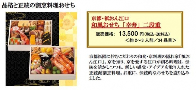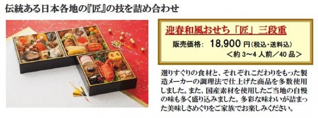 今年、シャディが特におすすめするおせちは、伝統ある日本各地の『匠』の技を詰め合わせた<迎春和風おせち「匠」三段重 18,900円(税込・送料込>、品格と正統の割烹料理おせち<京都・祇おん江口 和風おせち「幸寿」二段重 13,500円(税込・送料込)>、和洋ボリュームたっぷりでお買い得<家族団欒ボリューム和洋折衷おせち「慶福」三段重 15,800円(税込・送料込)>、そして少人数向けのおせち<京菜味のむら 京風おせち「小袖」二段重 8,208円(税込・送料込)>など、お客様の様々なニーズに合わせたおせちをバラエティ豊かに取り揃えました。