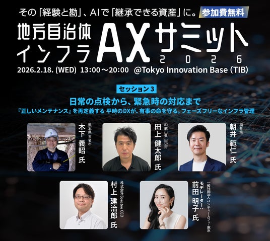 「地方自治体インフラAXサミット 2026」は、人口減少時代における持続可能なインフラ管理の実現を目指し、ベテランの経験と勘をAI等の技術で継承可能な資産に変える「AX(AI Transformation)」をテーマとしたイベントです。