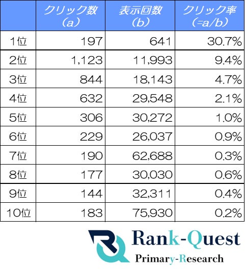 そこで今回、SEO対策支援実績4,300社超のランクエスト(https://rank-quest.jp/column/column/how-to-seo/ )は自社メディア(注)における2025年10月の最新データを分析。検索順位ごとに「クリック数」「表示回数」「クリック率(CTR=クリック数÷表示回数)」を比較し、検索順位がユーザー行動や集客にどのような影響を与えるのかを検証しています。