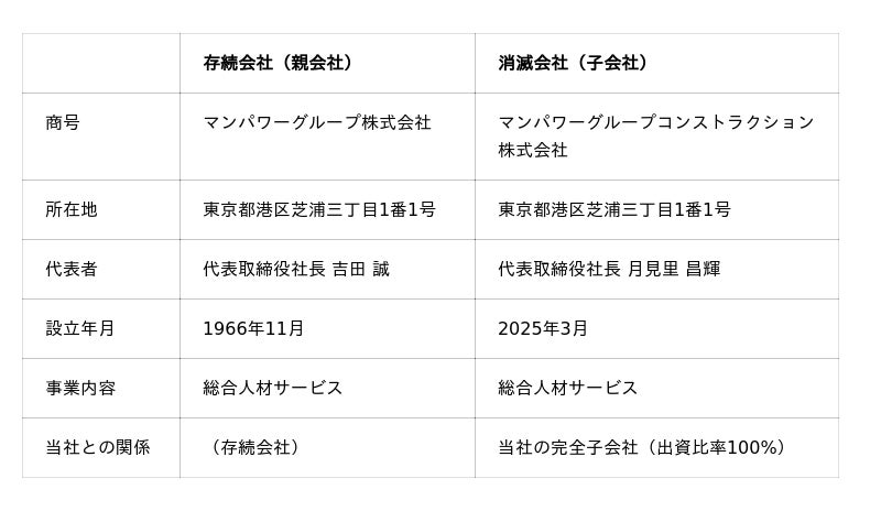 総合人材サービスのマンパワーグループ株式会社(本社:東京都港区、代表取締役社長:吉田 誠、以下「マンパワーグループ」)は、当社を存続会社、当社の完全子会社であるマンパワーグループコンストラクション株式会社(以下「消滅会社」)を消滅会社とする吸収合併(以下「本合併」)を実施いたしますので、下記のとおりお知らせいたします。
