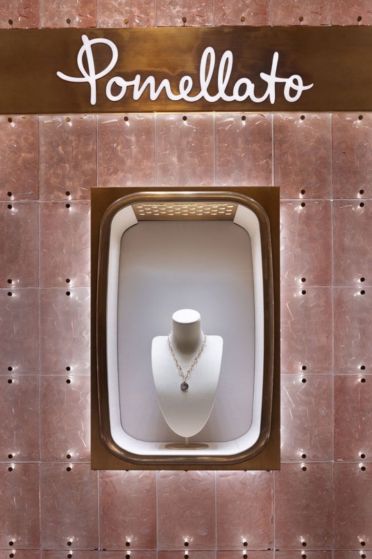 ポメラートブティック 阪急うめだ本店は、フロアに向けて明るく開かれた構造を採用し、ブランドを象徴するセンシュアルな曲線美と卓越した職人技を体現しています。店内中央には、ミラノの照明デザイナー6:AMによるガラスエレメントを用いたウォールを配置。淡いピンクトーンのガラスタイルが柔らかく光を反射し、ジュエリーの輝きを引き立てるとともに、空間に視覚的なリズムをもたらします。