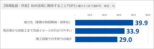 - BIM活用に期待することは、1位「省力化(業務の負担軽減・効率化)(39.9%)」、2位「発注者から技能工まで完成イメージがわかりやすい(33.9%)」、3位「施工段階での手戻りの減少(29.0%)」でした。1位「省力化(業務の負担軽減・効率化)(39.9%)」は、建設産業従事者1,257人の回答(32.5%)よりも割合が高いことから、時間外労働時間の上限規制の遵守と建設工事の工期厳守を両立すべく、現場監督・所長はBIM活用で省力化に期待する方が多いものと推測できます。
