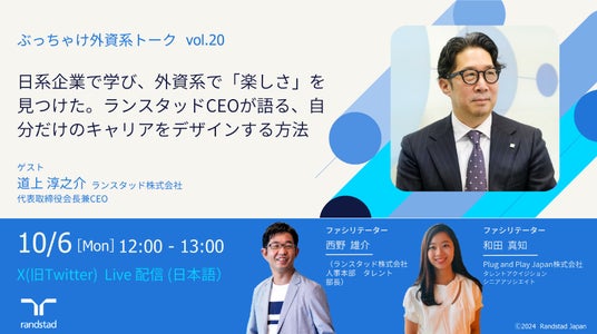 総合人材サービスを提供するランスタッド株式会社(本社:東京都千代田区 代表取締役会長兼CEO 道上 淳之介、代表取締役社長 猿谷哲)は、2025年10月6日(月)12時より、ソーシャルメディアX(旧Twitter)スペースにて、ランスタッド株式会社 人事本部タレント部長の西野雄介がファシリテーターを務めるライブ配信イベント「ぶっちゃけ外資系トーク」の第20回開催を記念し、同社 代表取締役兼CEOの道上 淳之介をゲストに迎えます。