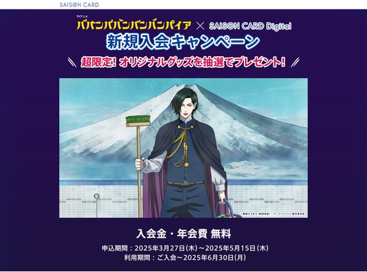 株式会社クレディセゾン(本社:東京都豊島区、代表取締役(兼)社長執行役員COO:水野 克己)は、TVアニメ「ババンババンバンバンパイア」とコラボレーションしたクレジットカード「SAISON CARD Digital<TVアニメ ババンババンバンバンパイア>」の新規入会キャンペーンを2025年3月27日(木)~2025年5月15日(木)まで実施します。