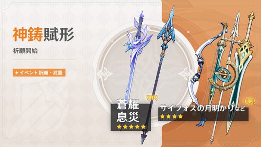 期間中、新★5武器「片手剣・蒼耀」、限定★5武器「長柄武器・息災」などの出現率が大幅にUPします。