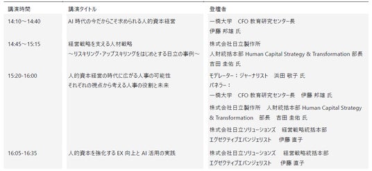 本セミナーでは、日本企業の持続的成長に向けた施策を示す「伊藤レポート」の作成に携わった一橋大学名誉教授伊藤 邦雄氏による基調講演のほか、各企業のユースケースをご紹介します。LINEヤフー株式会社で行われている人事関連データの活用とデータ分析を通じた価値提供や、日立ソリューションズが推進する人的資本強化に向けたEX(従業員体験)向上、社内業務やシステム開発におけるAI活用の取り組みなど、実践的な内容となっています。