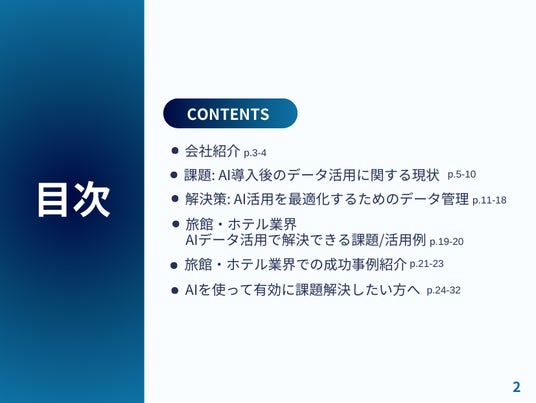 本レポートでは、AIを活用した客室稼働率の向上や顧客体験の改善、売上予測の精度向上といった成功事例を通じて、旅館・ホテル業界が持続的な競争力を維持するための具体的な戦略や実践方法について詳しく紹介しています。