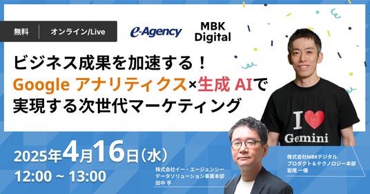 株式会社イー・エージェンシー(東京都千代田区、代表取締役:甲斐真樹、以下イー・エージェンシー)は、2025年4月16日に株式会社MBKデジタル(本社:東京都千代田区、代表者:芹澤新、以下MBKデジタル)と共催で、セミナー「ビジネス成果を加速する!Google アナリティクス×生成 AI で実現する次世代マーケティング」を開催いたします。