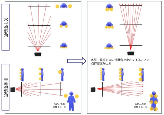 ・長距離検知において、距離が増すにつれてレーザー光の間隔が広がることで取得する点群の密度が低下する課題に対し、レーザー光の本数を保ったまま、水平・垂直方向の視野角を小さくすることが可能なガルバノスキャナを適用。視野角を小さくしレーザー光の間隔を狭めることで点群密度を高め、鉄道車両への搭載時に600メートル先の人や障害物の検知を実現