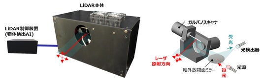 当社は今回、ガルバノスキャナ(※5)を適用し、レーザー光の水平・垂直方向の視野角を小さく設定して点群の密度を高めることで、遠方でも高精度な検知が可能なLiDARを開発しました。本技術により、鉄道車両走行時の前方監視の用途でLiDARを鉄道車両の運転席に搭載した場合に600メートル先の人の検知が可能となるほか、鉄道沿線の安全確認の用途で沿線に定点設置した場合に、600メートル先の20センチメートル程度の小さな落下物の検知が可能となります。さらに、付属のLiDAR制御装置に搭載した物体検出AIにより、点群データのみでは特定しづらい障害物の種類を高速・高精度に識別できます。