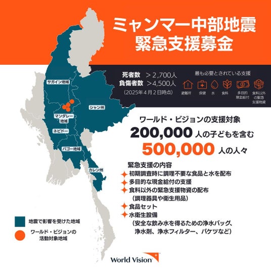 世界の子どもを支援する国際NGOワールド・ビジョンは、3月28日にミャンマーで発生した大地震の影響を受けた子どもたちが、家からの避難を余儀なくされ、また、学校に通えないことから、虐待を受けるリスクが高まっていると警鐘を鳴らします。
