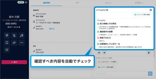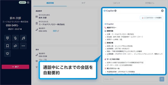 株式会社RevComm(レブコム、本社:東京都千代田区、代表取締役:会田武史)は、提供する電話解析AI「MiiTel Phone」において、通話中にリアルタイムで生成AIが業務を支援する新機能「MiiTel Synapse Copilot(ミーテル シナプス コパイロット)」リアルタイムトークアシスト機能を実装しました。