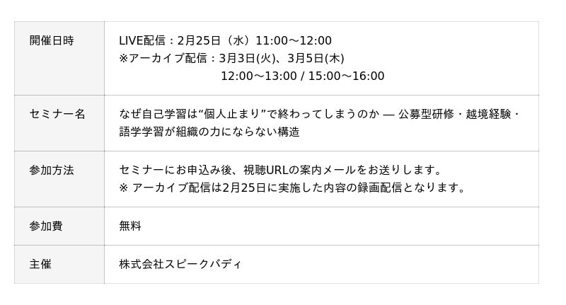 株式会社エンファクトリー(東京都千代田区、代表取締役社長CEO加藤健太)は、2026年2月25日(水)11:00-12:00にて、『なぜ自己学習は“個人止まり”で終わってしまうのか ― 公募型研修・越境経験・語学学習が組織の力にならない構造』セミナーに登壇します。(詳細はこちら:https://sbbiz.jp/event/260225?organizationId=1780)