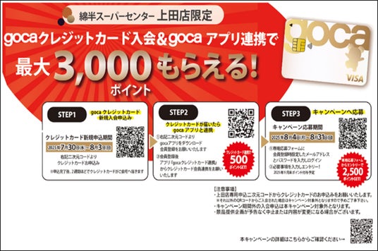 gocaクレジットカード入会&gocaアプリ連携で、最大3,000ポイントもらえるキャンペーンを実施します。
