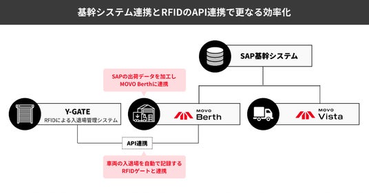 今回、両システムは、 基幹システムのSAP(※1)と連携していることに加え、「MOVO Berth」は車両の入退場を自動で記録するRFID (※2)ゲートシステムと連携し、物流業務の効率化と標準化を、一層加速させます。