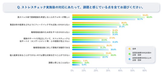 - ストレスチェック実施「後」の課題については「高ストレス者のフォロー」が最も多く挙げられる。