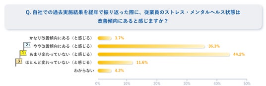 - 自社のストレス・メンタルヘルスの状態における経年変化について、4割は「改善している」と回答した一方、約4.5割が「変わらない」と回答している。