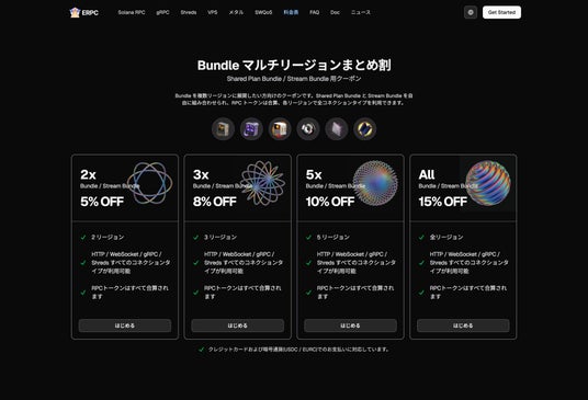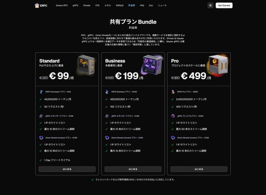 ERPC では、実運用およびスケールを前提とした利用に向けて、Bundle プランを提供しています。Bundle プランでは、RPC / WebSocket / gRPC / Shreds をまとめて利用でき、単体での契約と比較してコスト効率の高い構成を取ることができます。