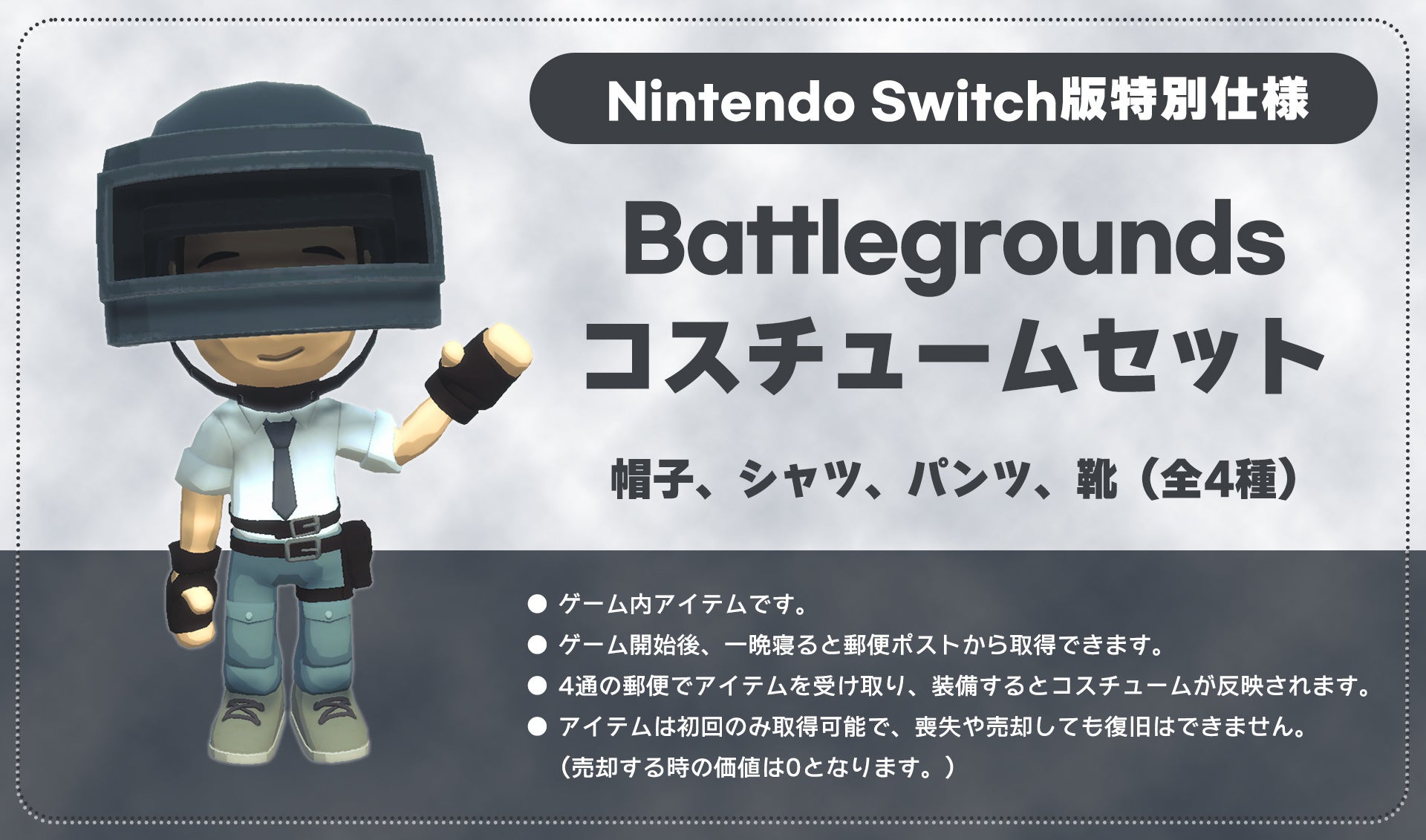 ご購入いただいた方に、ゲーム内アイテム「PUBG: BATTLEGROUNDSコスチュームセット」をプレゼントいたします。