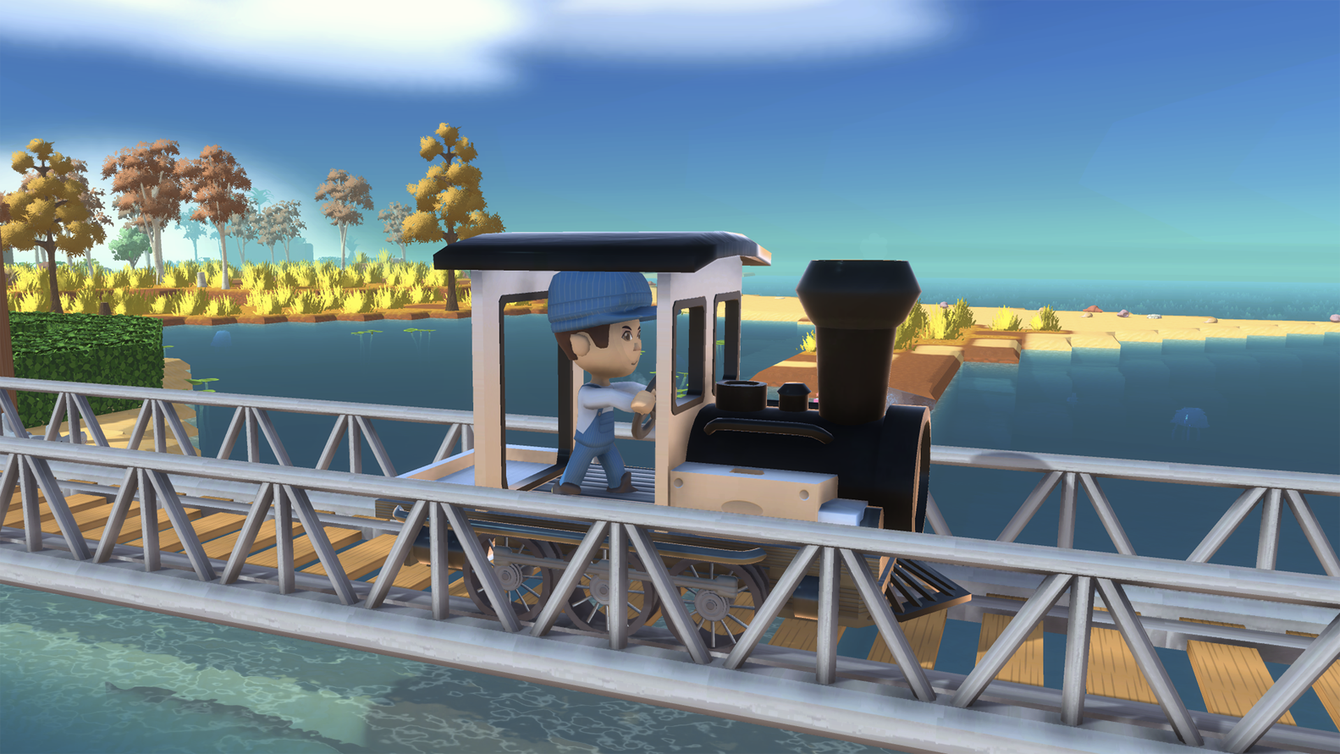 NPCのフランクリンを通じて製作できる機関車は、プレイヤーが島に線路と鉄道橋を建設して自由に運行ができるコンテンツです。直線と曲線の線路を接続したり、島の地形に沿って橋を設置したり、独自の鉄道システムを構築したりできます。