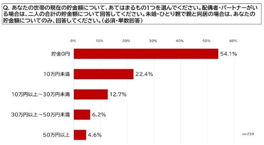 世帯の貯金額について、「0円」と回答した人が54.1%、「10万円未満」が22.4%にのぼり、一般応募者の8割近くが貯金額10万円未満であることが明らかに。また、応募者が抱える悩みとして9割近くが「妊娠・出産で思うように働けないのでお金が心配」と回答。