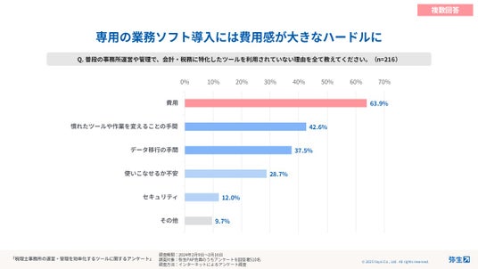 弥生の調査によると、約85%の会計事務所が、日々の事務所運営・管理の業務効率化を必要と感じています。一方で、実際に事務所運営・管理のための業務システムを導入している事務所は約30%に留まっています。また、業務システムの導入をしない理由としては、63.9%が「費用」、42.6%が「慣れたツールや作業を変えることの手間」を選択していました。