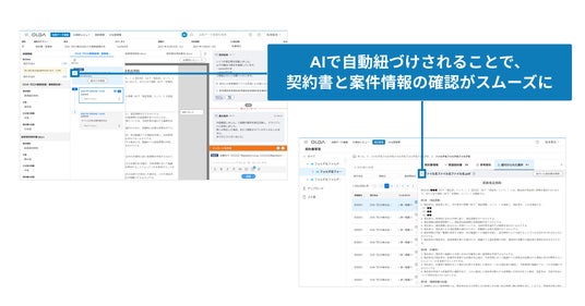 GVA TECH株式会社(本社:東京都渋谷区、代表取締役:山本 俊、以下GVA TECH)は、当社が提供する法務オートメーション「OLGA」において、契約管理機能にアップロードされた契約書と法務データ基盤内の案件情報を、AIが自動で紐づける新機能をリリースしたことをお知らせします。