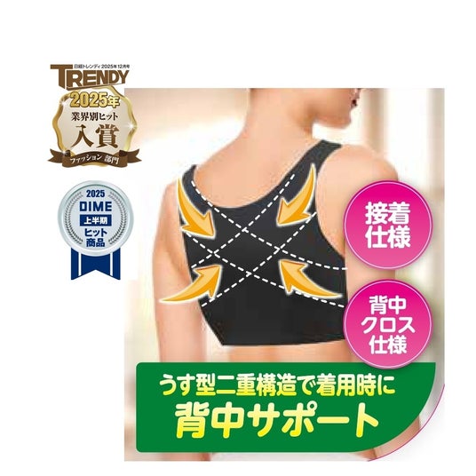 背中のクロス部分にパワーネット生地を使用し、程よく引き締め、背中がスッキリして猫背対策になります。