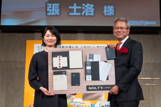 本年は阿部暁子氏の『カフネ』(講談社)が大賞を受賞し、当社代表の張より、お祝いの言葉と共に、副賞として「NOLTY能率手帳ゴールドメモティ」「4月始まり NOLTY TiO(ティオ)セット」「NOLTYノートブック」「本革リーガルパッドホルダー」を贈呈しました。