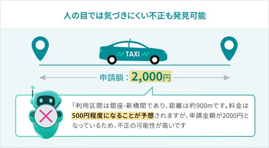 交通費に関する申請は、AIが申請に記載された利用区間をもとに利用金額の妥当性を検証するため、タクシーの不正利用なども見つけやすくなります。また、AIが過去の申請を含むすべてのデータを網羅的に点検するので、領収書の使いまわしなども容易に検知できます。