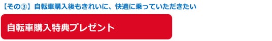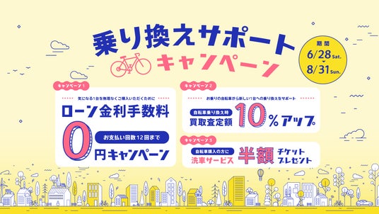 当キャンペーンでは、お客様に無理なく新車をご購入いただくためのサポートや、不要になった自転車の買取りをさせていただき、新しい自転車への乗り換えをお手伝いします。また、キャンペーン期間中に自転車をご購入いただいたお客様には、お気に入りの自転車に長くお乗りいただけるよう、洗車サービス半額チケットもプレゼントいたします。