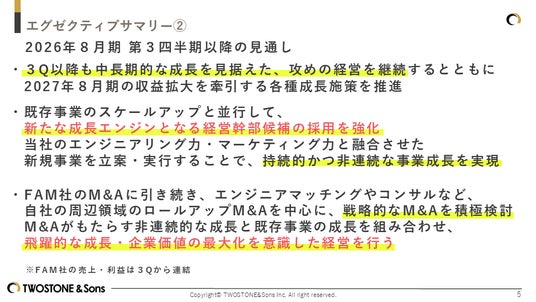 そのために既存事業のスケールアップと並行して、新たな成長エンジンとなる経営幹部候補の採用を強化してまいります。エンジニア力やマーケティング力といった当社の強みを生かした新規事業の立案・実行をすることで、持続的かつ非連続的な事業成長を実現してまいりたいと考えております。