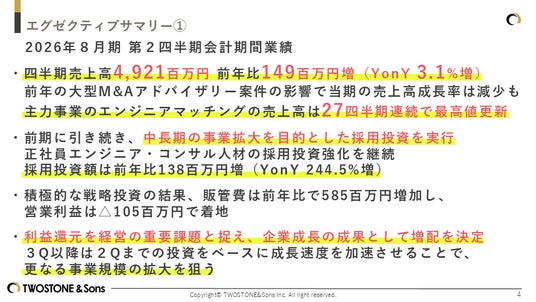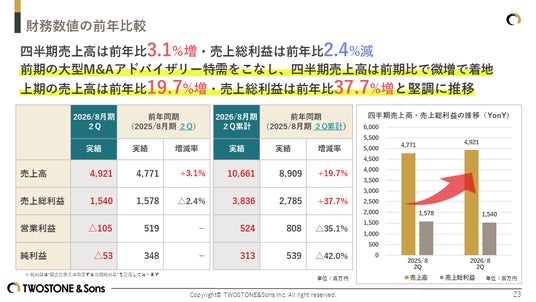 株式会社TWOSTONE&Sons(所在地:東京都渋谷区、代表取締役CEO:河端保志、代表取締役COO:高原克弥、証券コード:7352、以下 当社)は、本日2026年4月14日、2026年8月期 第2四半期決算を発表しました。