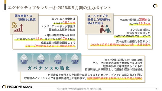 2026年8月期は、「既存事業への積極的な投資」「ロールアップを駆使した戦略的なM&Aの実行」「ガバナンスの強化」の3点を注力ポイントとして掲げております。